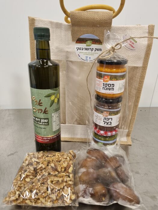 סל השפע-סל יוטה -שמן זית טהור, אגוזי מלך, תמר בונבון, 3 ממרחים מהאתר.
